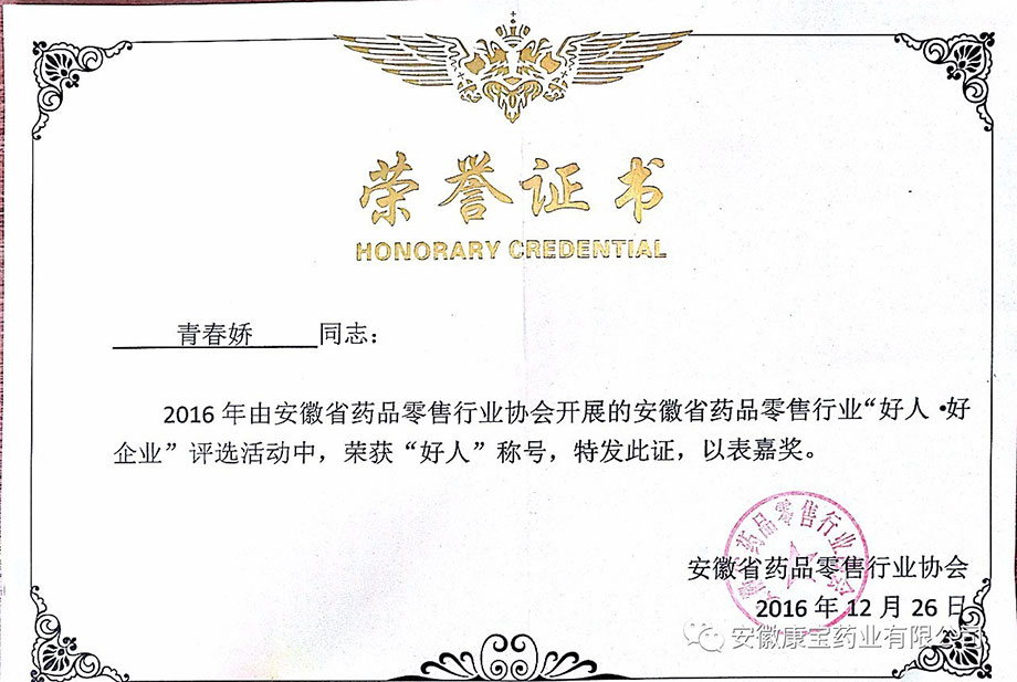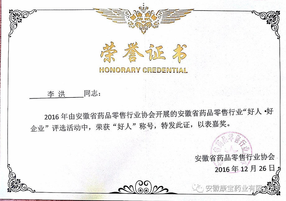 歲末好事不斷,康寶獲獎連連。12月26日,由省藥品零售行業(yè)協(xié)會主辦的安徽省藥品零售企業(yè)“好人 好企業(yè)”頒獎典禮在省城合肥隆重舉行。淮南東方醫(yī)院集團全資子公司康寶藥業(yè)通過逐級推薦、層層考核、公開評審等程序,最終被評為“好企業(yè)”稱號,康寶藥業(yè)員工青春嬌、李洪被評為“好人”稱號。