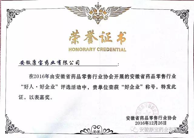 12月26日,由省藥品零售行業(yè)協(xié)會主辦的安徽省藥品零售企業(yè)“好人 好企業(yè)”頒獎典禮在省城合肥隆重舉行。康寶藥業(yè)經(jīng)過逐級推薦、層層考核、公開評審等程序,最終被評為“好企業(yè)”稱號,康寶藥業(yè)員工青春嬌、李洪被評為“好人”稱號